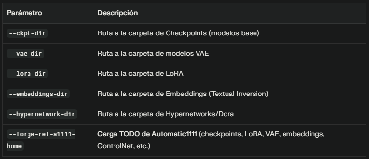 Esta guía cubre la referencia integrada a Automatic1111 mediante --forge-ref-a1111-home, que permite cargar automáticamente todos los checkpoints, LoRAs, embeddings, hypernetworks y modelos ControlNet desde tu instalación existente sin duplicación de archivos. También explora opciones avanzadas como --api para automatización, --theme dark para personalización de interfaz, y banderas de debugging para troubleshooting.