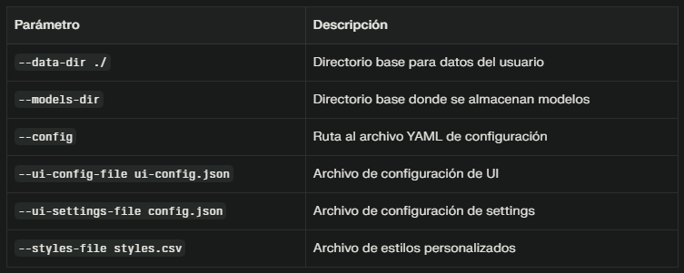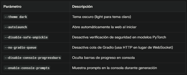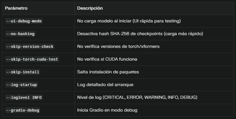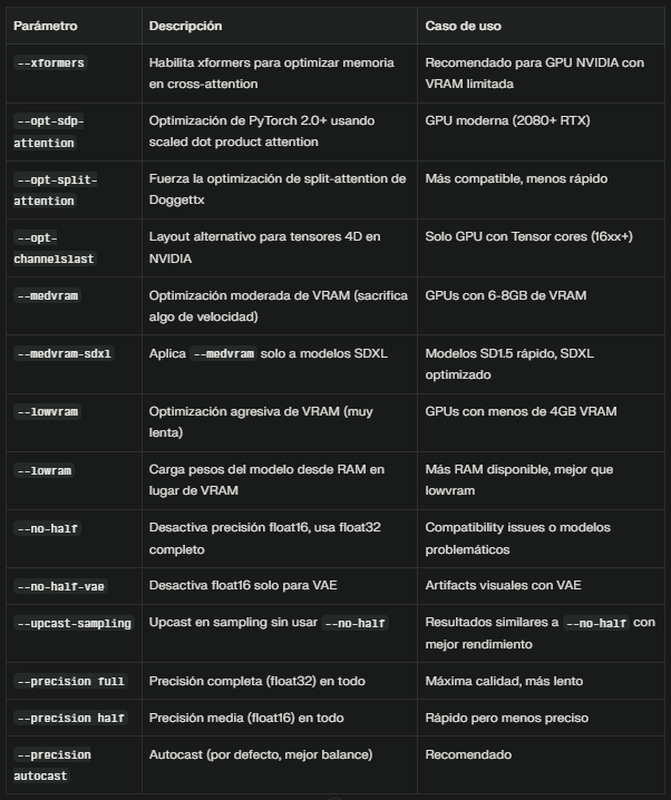 Cada argumento de línea de comandos controlará aspectos específicos: desde la optimización de memoria de video (VRAM) con --xformers y --opt-sdp-attention, hasta la precisión de cálculo con --precision half y --no-half-vae. La configuración incorrecta puede resultar en tiempos lentos de generación, consumo excesivo de memoria, incompatibilidades con ControlNet o artifacts visuales indeseados.