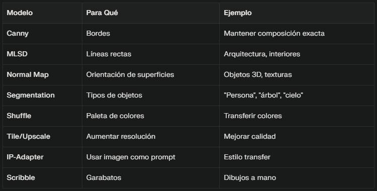 ControlNet necesita modelos específicos para funcionar. Los más importantes son: