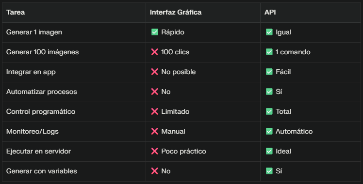 Con la API puedes generar cientos o miles de imágenes automáticamente sin intervención manual. La interfaz gráfica requiere hacer clic en "Generate" cada vez.