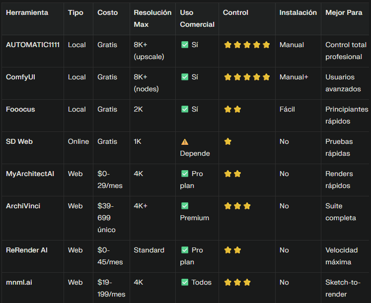 Las herramientas de IA para visualización arquitectónica están evolucionando rápidamente. La combinación de herramientas locales (AUTOMATIC1111/ComfyUI) con plataformas web especializadas ofrece el workflow más potente: